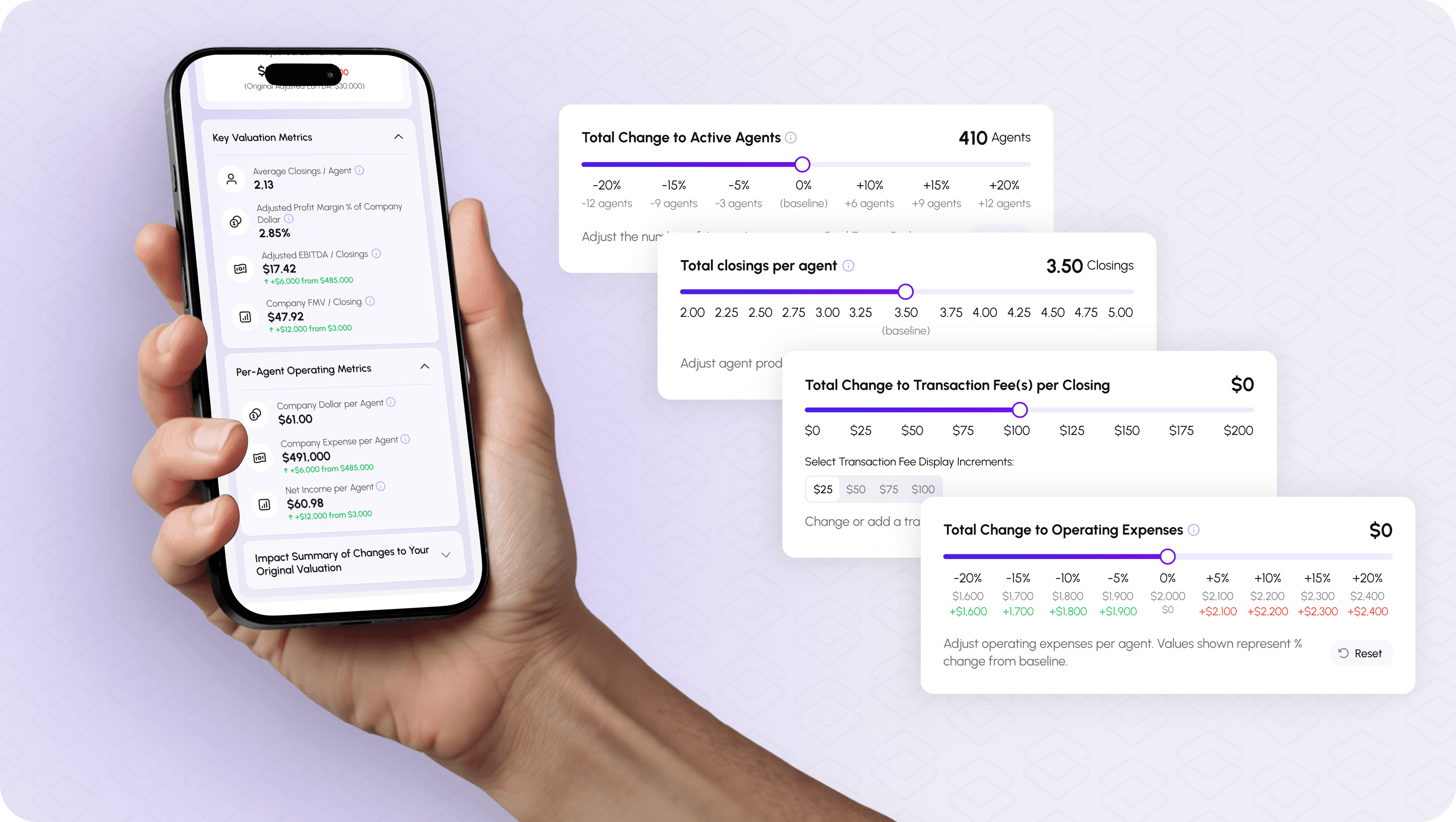 Interactive sliders for agent count changes and fee adjustments that recompute valuation metrics in real time using Valtio reactive state. Baseline vs. current comparison snapshots. Per-agent and per-closing derived metrics surfaced across dashboard cards and insight views.
