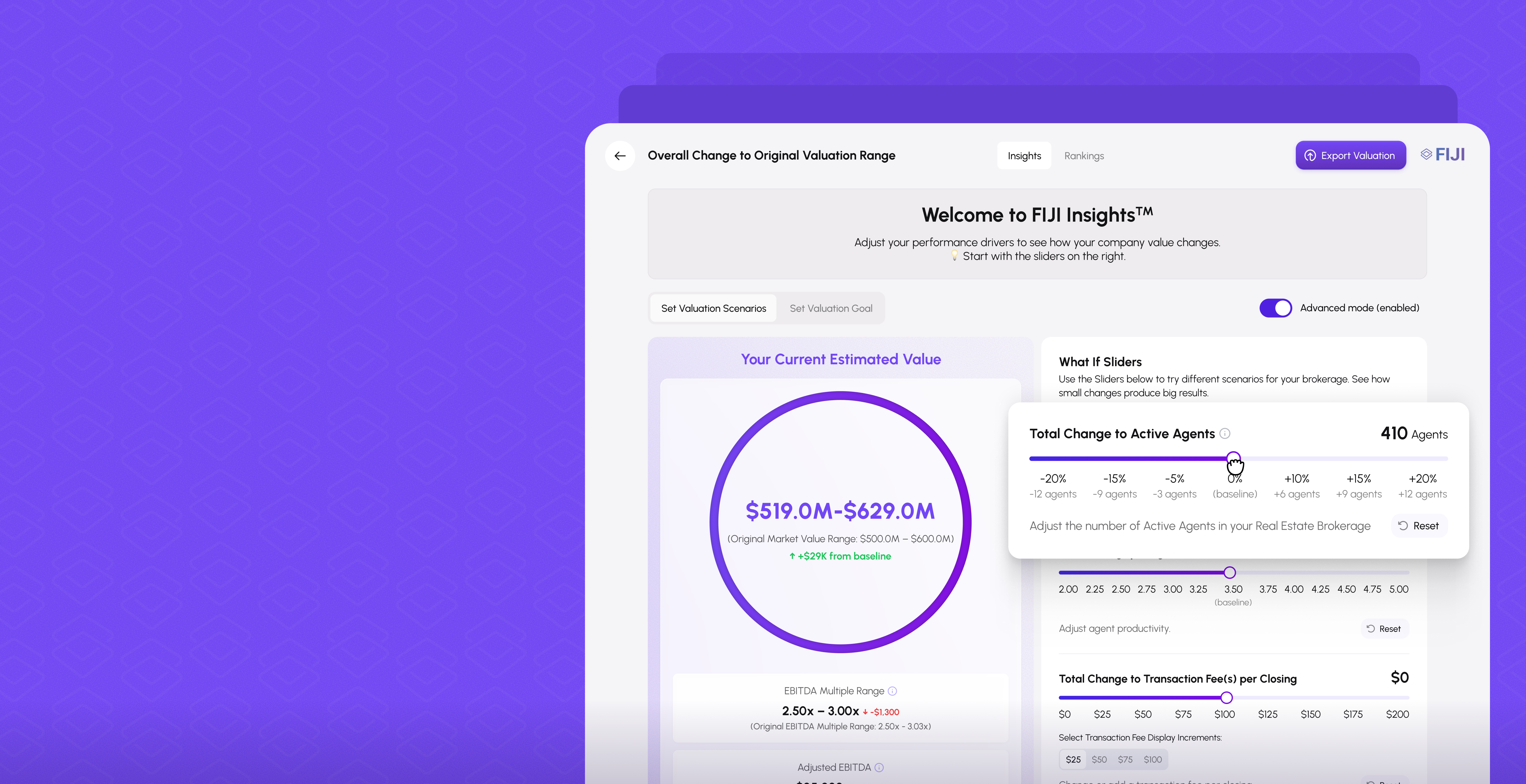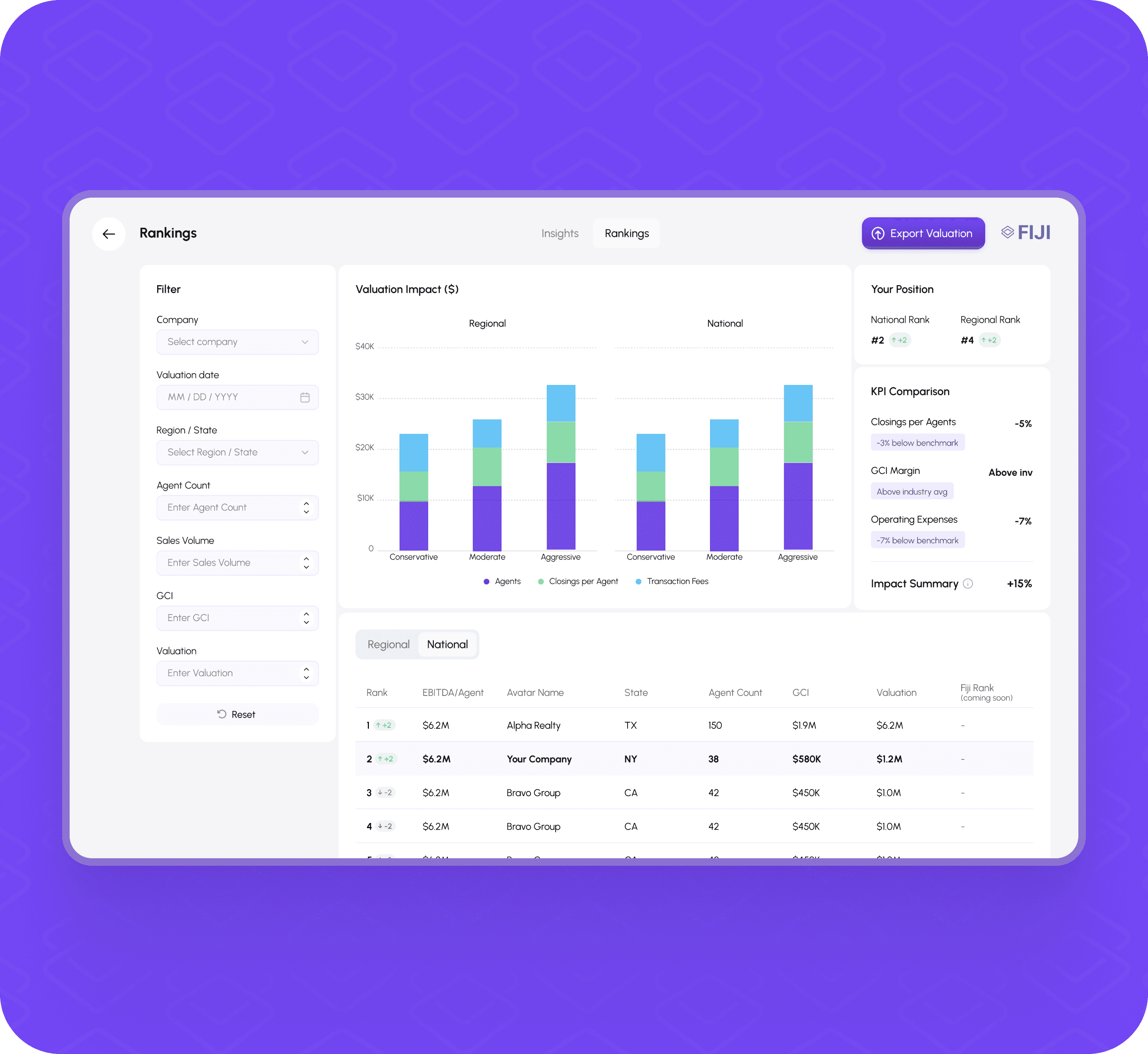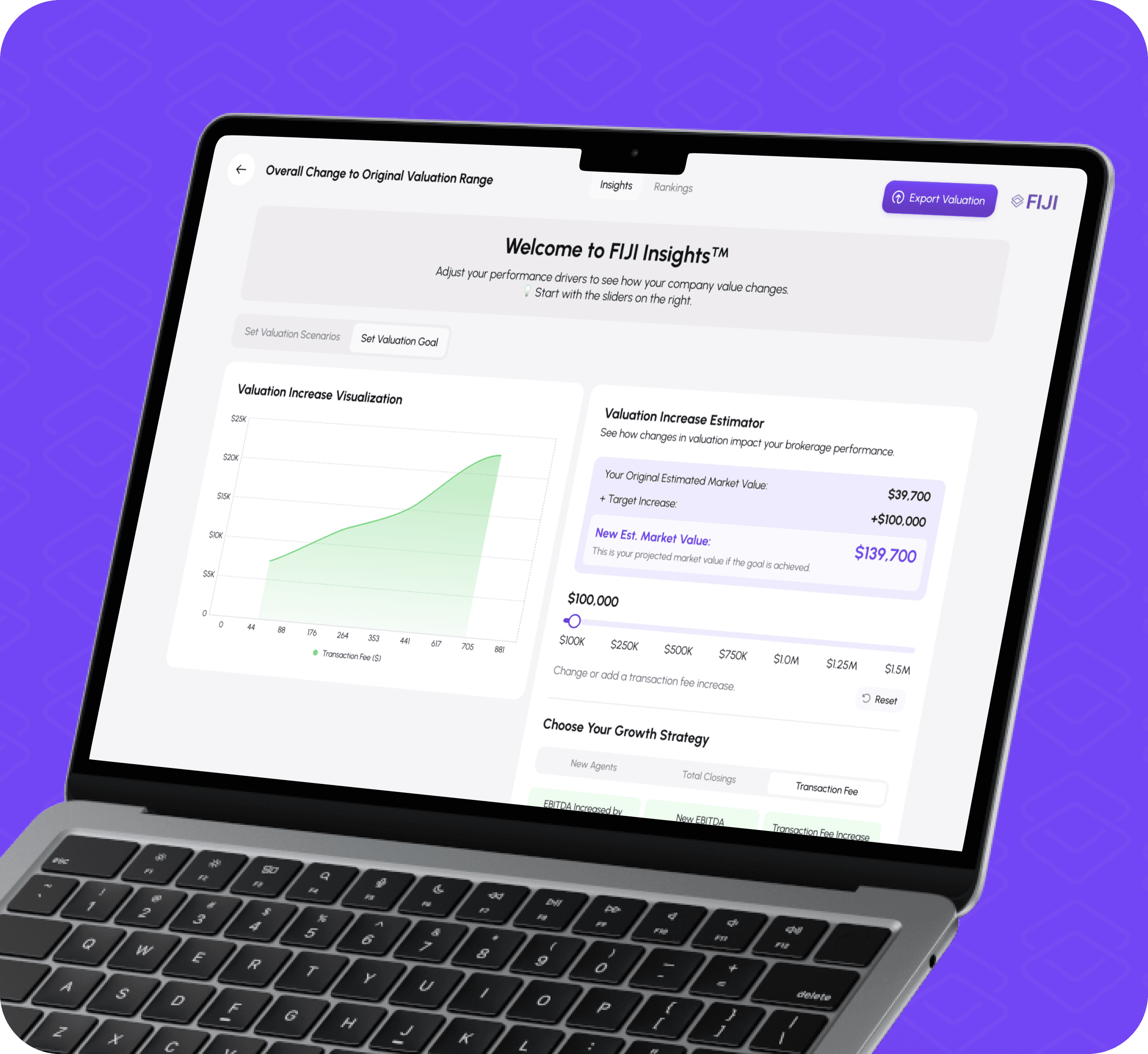FIJI Insights set out to change that — a platform purpose-built to give residential real estate brokerages and teams accurate, data-driven valuations, then connect them with acquisition-ready buyers through a secure marketplace. It is not a generic business tool. It speaks the language of GCI, company dollar, agent count, commission splits, and MSA adjustments.
